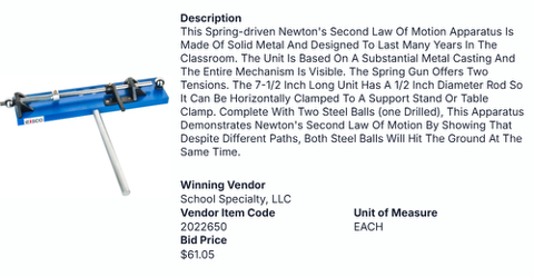 The rig to be used in 2026 is the same as last year. It is the Eisco Labs Newton's Second Law of Motion Apparatus.